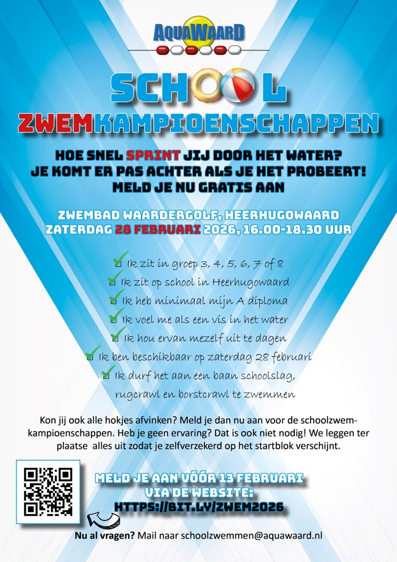 Zwem- en polovereniging AquaWaarD organiseert zaterdag 28 februari de schoolzwemkampioenschappen in zwembad Waardergolf en jij kan hier aan GRATIS meedoen! Wil jij wel eens weten of je een snelle zwemmer bent, of ervaren of je wedstrijdzwemmen leuk vindt? Of wil je gewoon voor jezelf een…